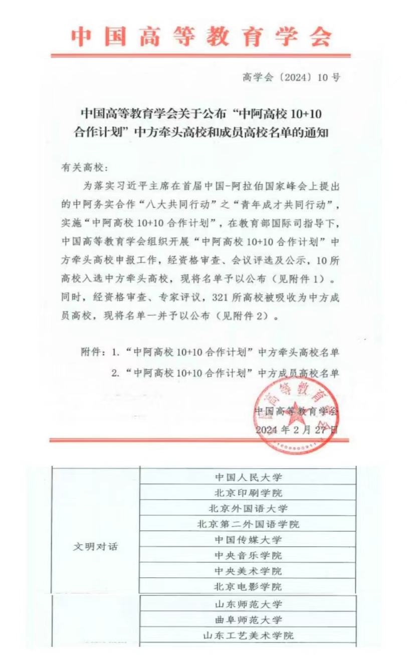 曲阜师大国际交流合作处讯 近日,中国高等教育学会公布“中阿高校10+10合作计划”中方牵头高校和成员高校名单,全国共有10所高校入选中方牵头高校,321所高校被吸收为中方成员高校,乐鱼(中国)入选文明对话领域的中方成员高校。