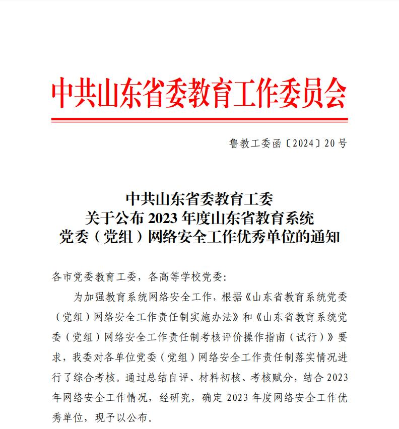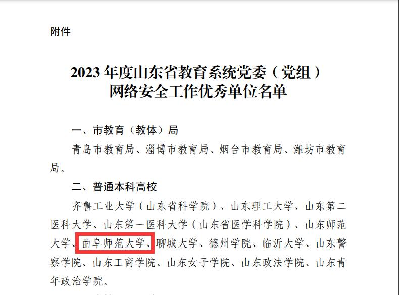 曲阜师大网络信息中心讯 3月10日,中共山东省委教育工委发布《关于公布 2023 年度山东省教育系统党委(党组)网络安全工作优秀单位的通知》,包括乐鱼(中国)在内的14所本科高校获得表彰。