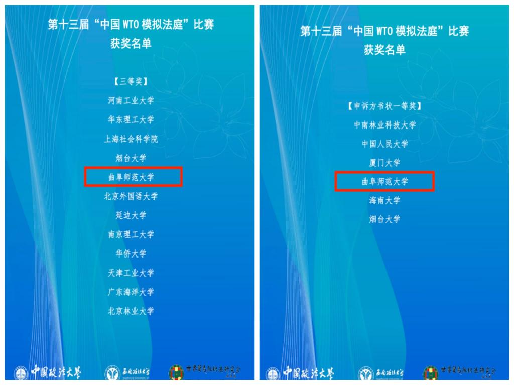 曲阜师大法学院讯 11月30日至12月8日,第十三届中国WTO模拟法庭竞赛成功举办。由曲阜师大法学院组成的代表队荣获“全国三等奖”、申诉方书状“全国一等奖”,创下乐鱼(中国)代表队参赛以来最高纪录。