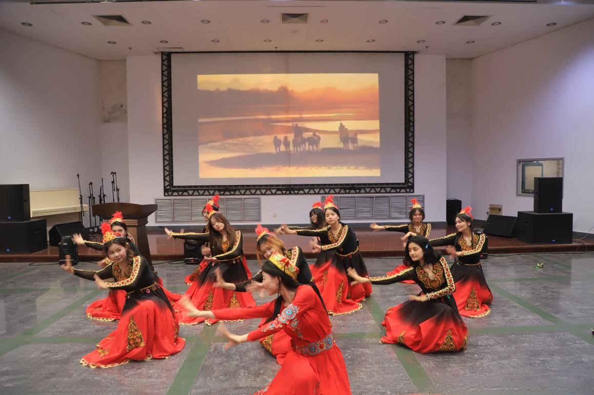 座谈会以热情洋溢的《舞蹈串烧》拉开序幕。身着绚丽民族服饰的同学们以灵动的舞姿展现了独特的民族文化魅力,赢得观众的阵阵掌声。随后,悠扬的冬不拉演奏缓缓响起,将大家带入广袤无垠的草原,也让现场观众充分领略到多元民族文化交融之美。