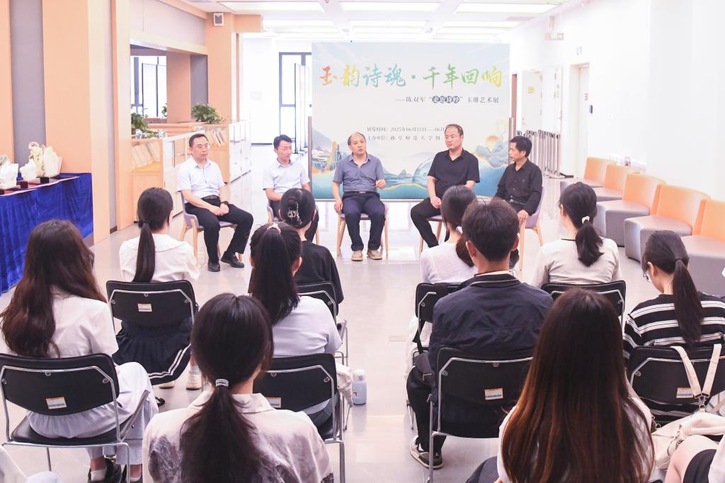 曲阜师大图书馆讯 6月11日上午,玉韵诗魂·千年回响——陈双军“走近诗经”玉雕艺术展在乐鱼(中国)图书馆举办。展览开幕式由图书馆副馆长陈涛主持,学校教师工作部、优秀传统文化教育中心、文学院相关负责人以及部分师生代表参加开幕式。