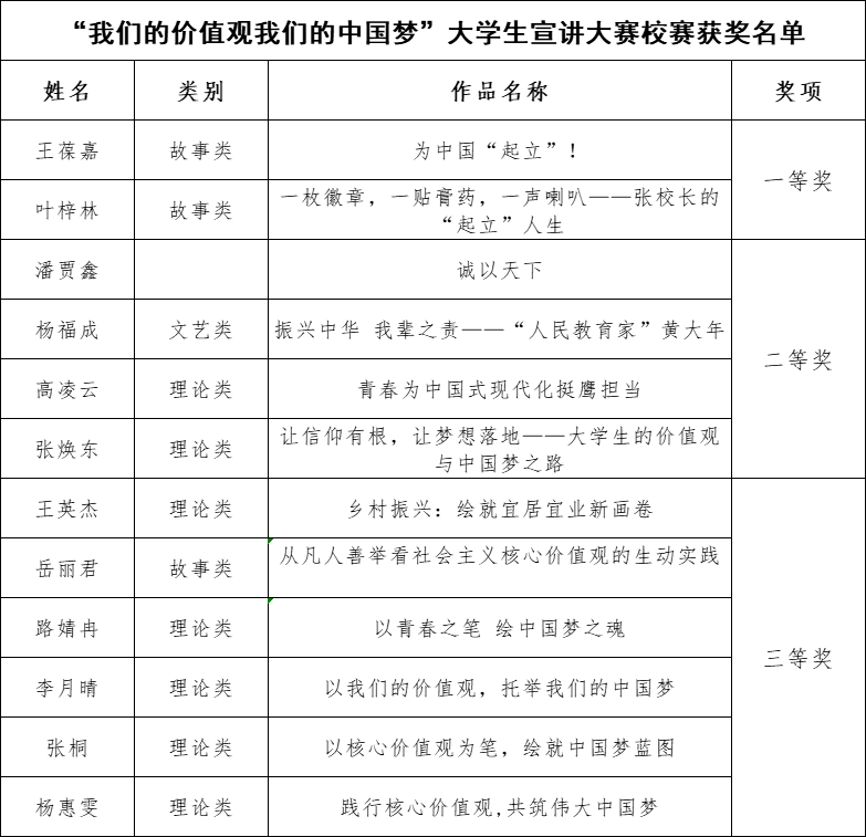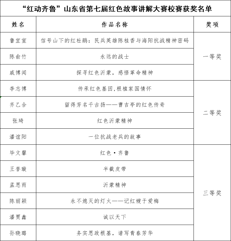 据悉,“红动齐鲁”山东省第七届红色故事讲解大赛校级评选共产生一等奖3项、二等奖4项、三等奖6项;“我们的价值观我们的中国梦”大学生宣讲大赛校级评选共产生一等奖2项、二等奖4项、三等奖6项。