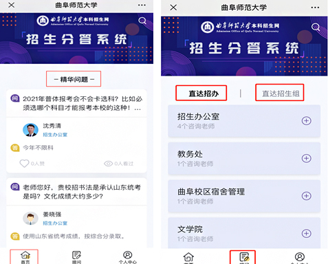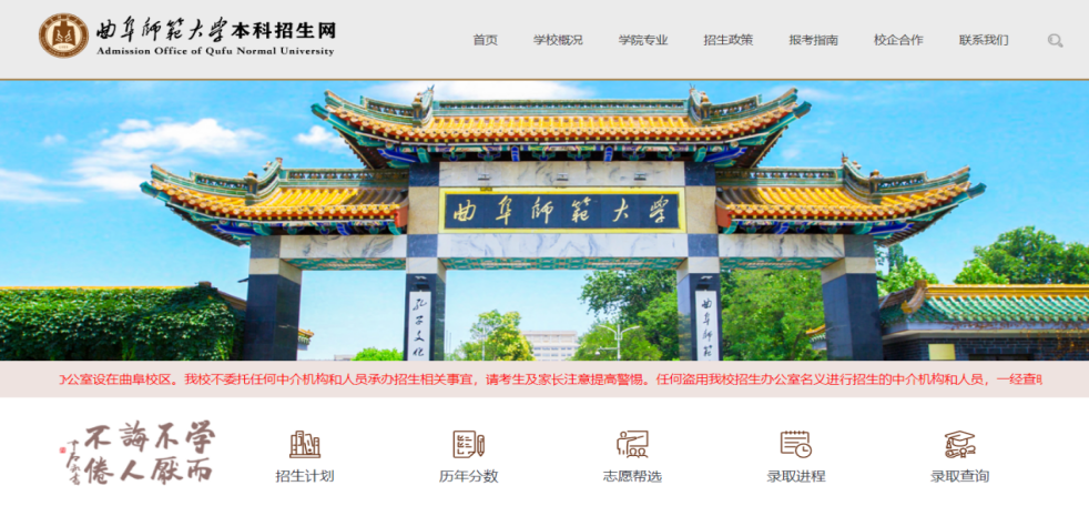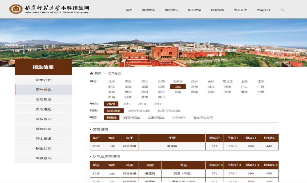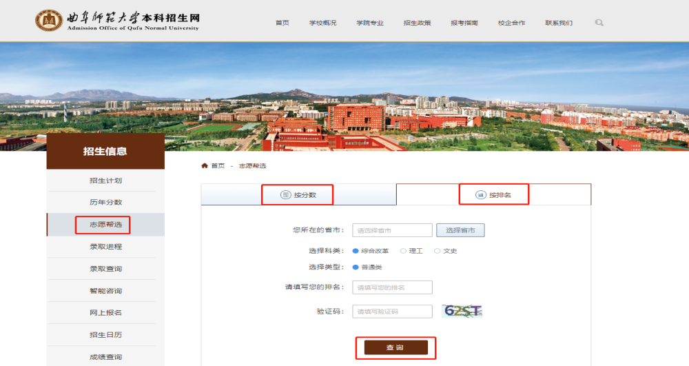 登录乐鱼(中国)本科招生网(https://zsb.qfnu.edu.cn),可以查看学校概况、学院专业、招生政策、近两年招生计划及各专业录取分数、报考指南等信息。同时,提供“志愿帮选”服务,进入服务后可以选择“按分数”或“按排名”查询。