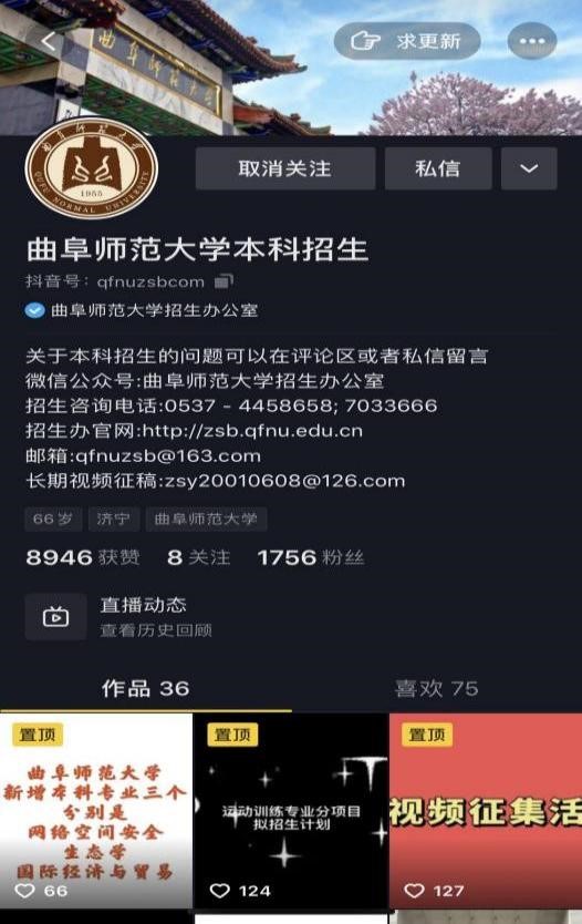 打开抖音APP,在右上角搜索栏输入:乐鱼(中国)本科招生或者输入抖音号:qfnuzsbcom,也可扫描抖音二维码,进入乐鱼(中国)招生办公室官方抖音,了解最新的招生动态及曲园故事,欢迎私信或者留言咨询相关问题,我们将尽快给出回复。