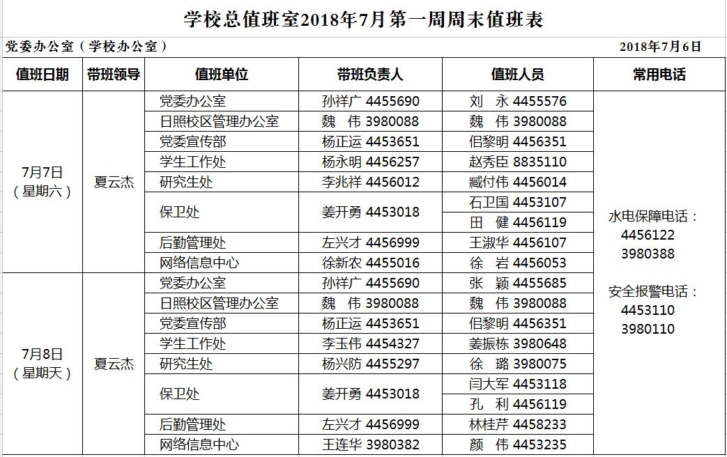 学校总值班室2018年7月第一周周末值班表