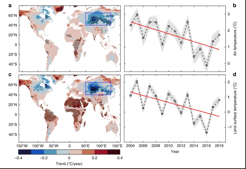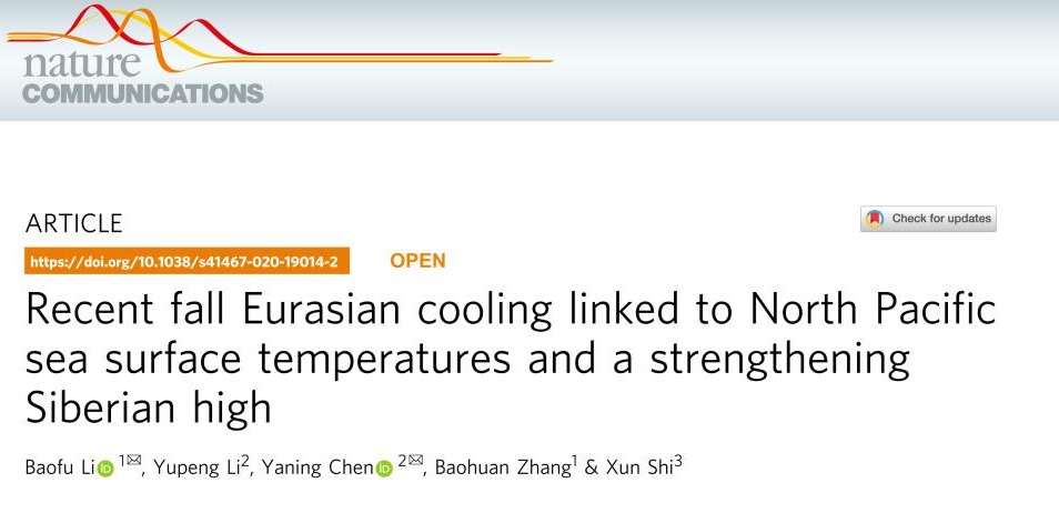 针对这些问题,我们团队聚焦区域气候水文演变格局及其对全球变化的响应机制开展研究。结果发现,在全球变暖背景下欧亚大陆秋季却出现秋季降温现象,这显示出区域气候系统演变的复杂性。同时,我们从全球大气环流、积雪等下垫面的气候反馈等角度深入探索了区域气候演变的驱动机制及其影响,填补了对秋季降温现象与机制认识的空白,解答了全球气候变暖海拔依赖性的争议,细化了地表径流归因框架,阐明了典型河流径流对气候变化的响应机理等系列科学问题。相关成果以第一/通讯作者发表在《自然-通讯》(Nature Communications)、JGR-Atmospheres、Environmental Research Letters、Journal of Hydrology等国际知名期刊上,并被中国科学院、美国CO2 Coalition、美国知名媒体News Break等国内外科研单位和媒体报道。