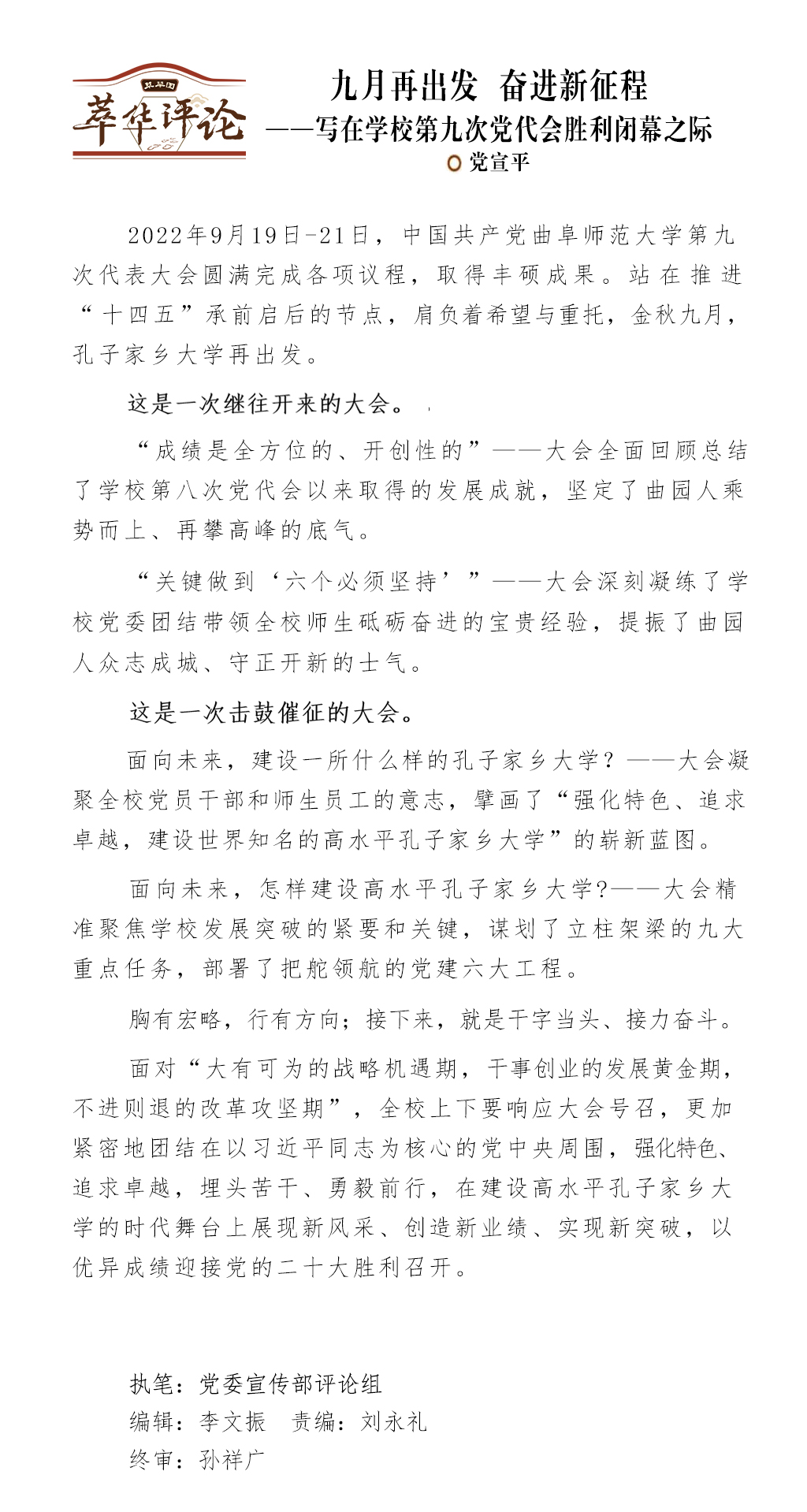 九月再出发 奋进新征程——写在学校第九次党代会胜利闭幕之际