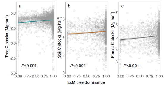 注:图为外生菌根(EcM)优势度与森林碳库的关系