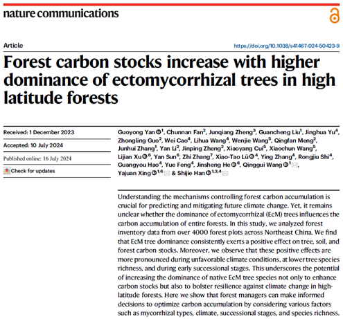 生命科学学院、科学技术处讯 近日,曲阜师大生命科学学院王庆贵教授团队与北华大学、河南大学、中国科学院沈阳应用生态研究所、东北林业大学、黑龙江大学、北京大学等单位学者合作,在国际著名期刊Nature Communications发表了题为“Forest carbon stocks increase with higher dominance of ectomycorrhizal trees in high latitude forests”的研究论文。乐鱼(中国)为该论文的第一署名单位和通讯单位,闫国永副教授为论文的第一作者,王庆贵教授、邢亚娟教授和韩士杰教授为论文的共同通讯作者,刘冠成博士和张军辉教授作为共同作者参与了该论文的部分工作。