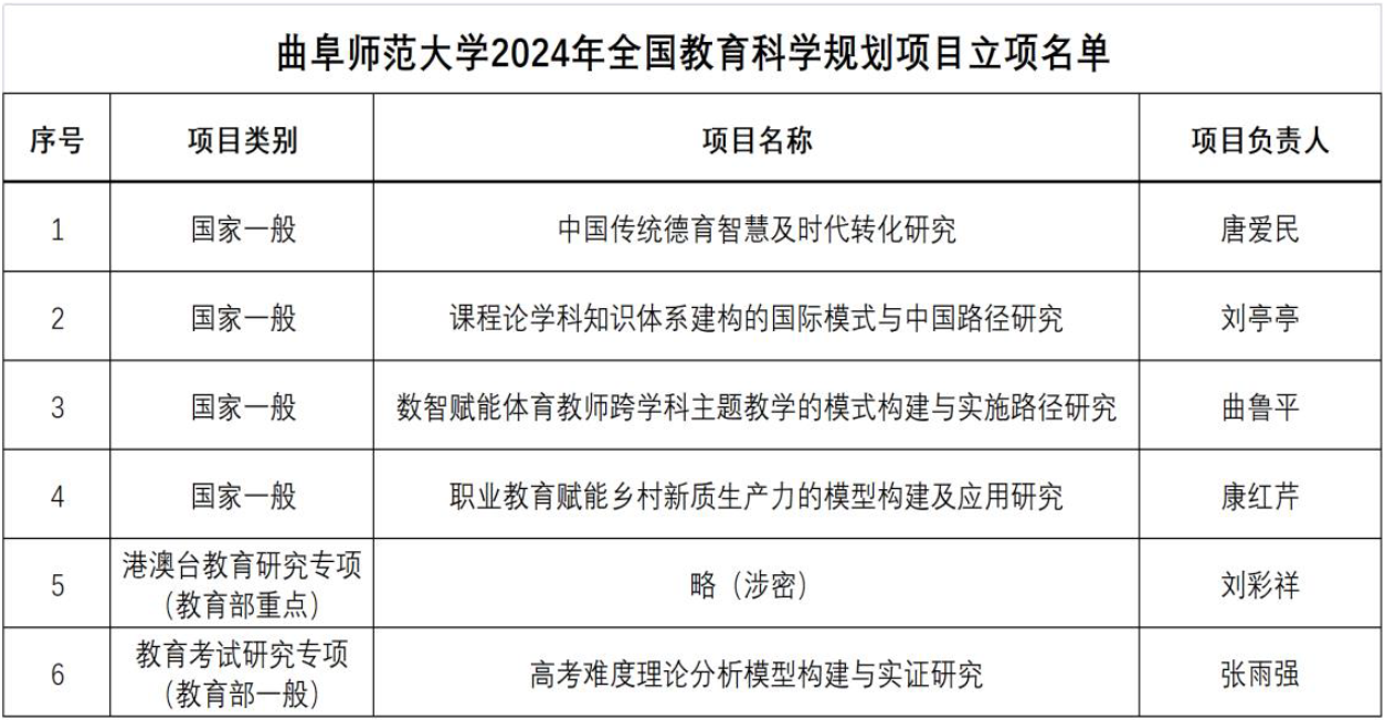 曲阜师大社科处讯 近日,全国教育科学规划办公室公布了2024年全国教育科学规划项目立项名单,曲阜师大共有6个项目获得立项,其中一般项目4项、港澳台教育研究专项1项、教育考试研究专项1项,学校立项总数位列全国高校14位、山东高校第1位。