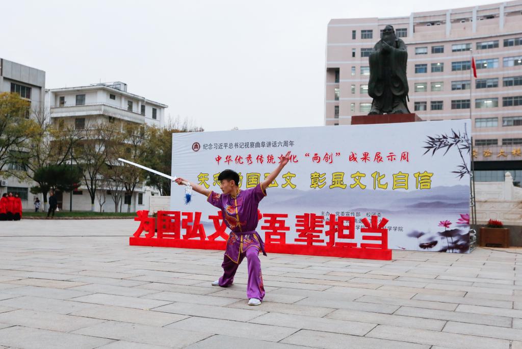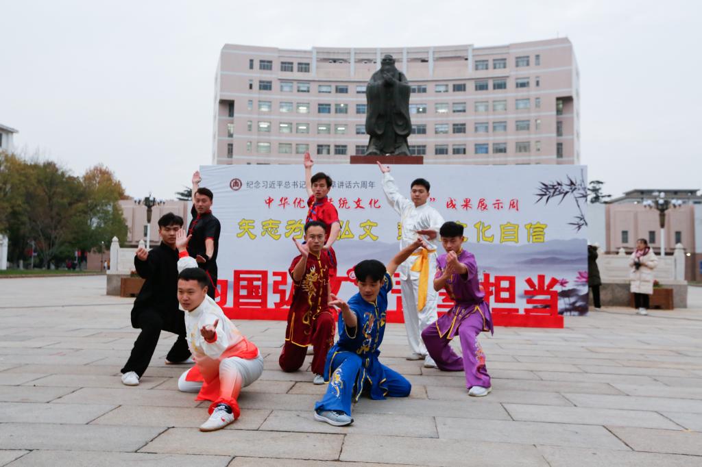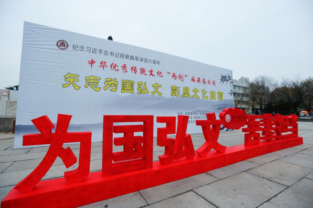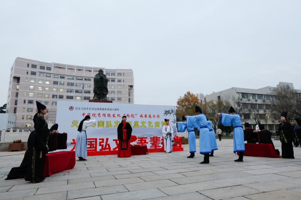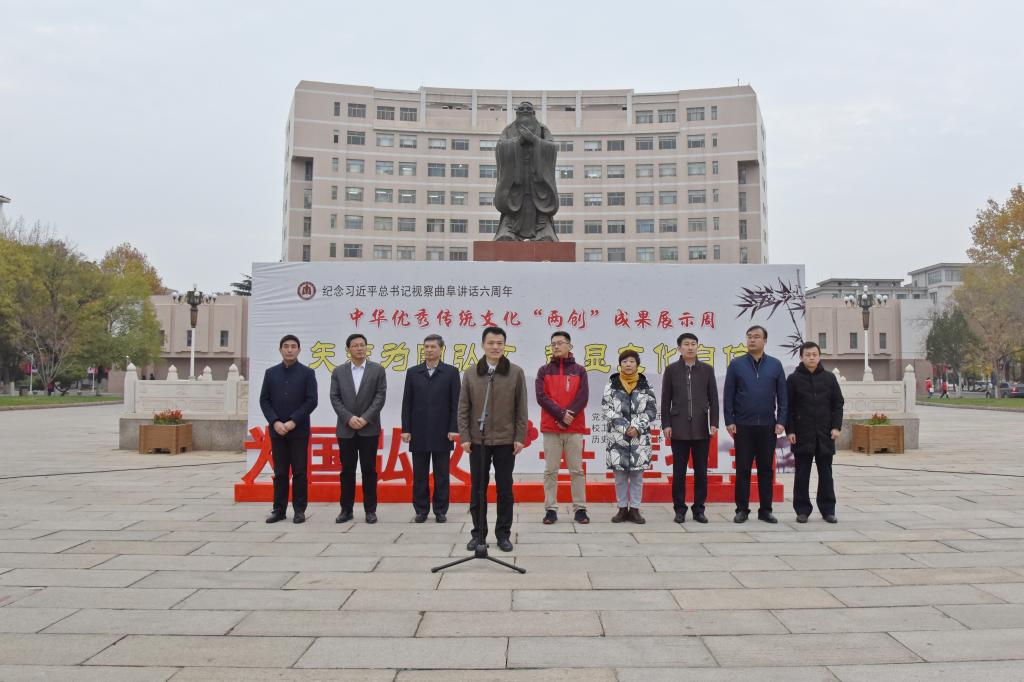 为纪念习近平总书记视察曲阜6周年重要讲话,推动落实“文化立校”战略,推进中华优秀传统文化在我校“创造性转化、创新性发展”,塑造以“韧性、睿性、德性”为核心的新时期曲园精神,我校乐鱼官方网页版、校团委、校工会、离退休工作处、历史文化学院、体育科学学院、书法学院等单位联合举办中华优秀传统文化“两创”成果展示周活动。11月26日下午,“两创”成果展示周活动开幕式在孔子文化广场举行。