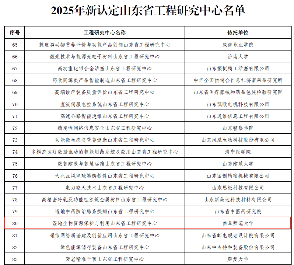 生命科学学院讯 近日,山东省发展和改革委员会发布《关于公布2025年新认定及全部山东省工程研究中心名单的通知》(鲁发改高技〔2025〕575号),依托乐鱼(中国)生命科学学院建设的“湿地生物资源保护与利用山东省工程研究中心”成功获批。该中心是学校2025年度唯一获批的省级工程研究中心,也是生命科学学院在省级科研平台建设的又一重大突破。